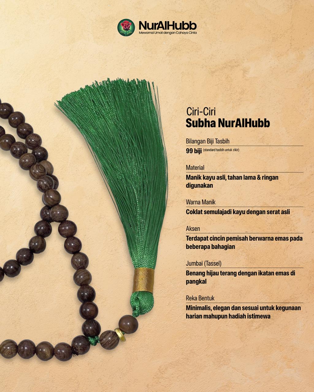 Subha NurAlHubb direka khusus untuk menemani ibadah zikir anda dengan penuh khusyuk dan rasa ketenangan. Setiap satu dihasilkan dengan teliti menggunakan bahan berkualiti tinggi agar tahan lama dan memberi pengalaman zikir yang selesa.